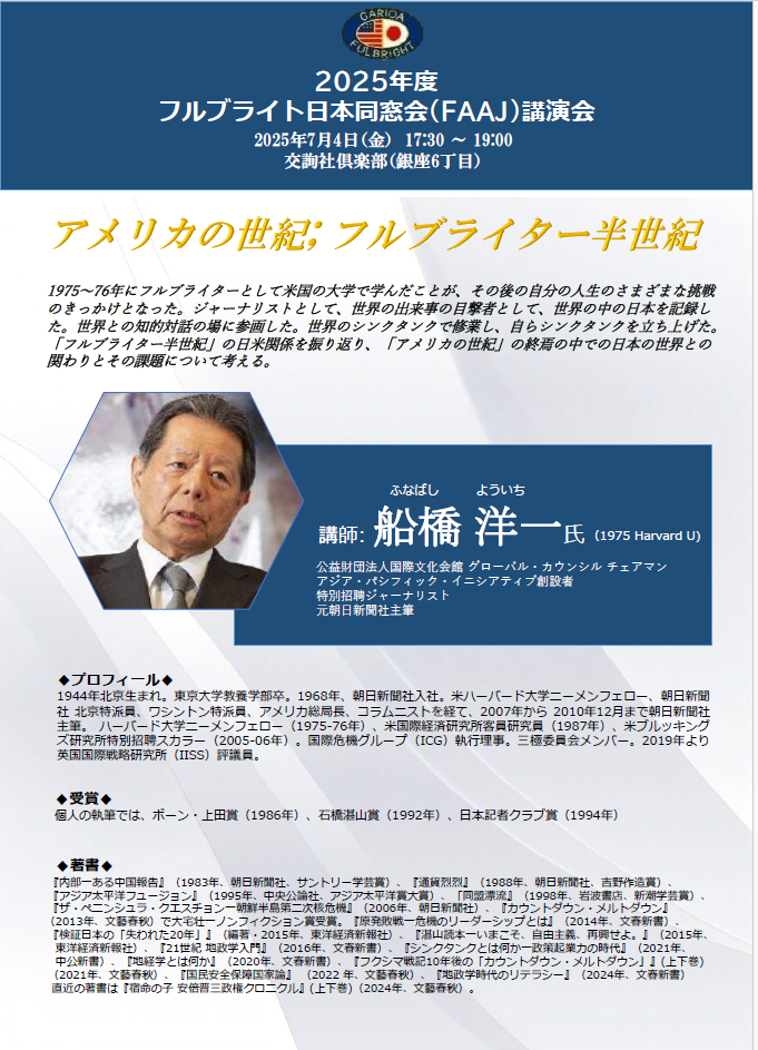 講演会では、船橋洋一氏を講師としてお迎えし、「アメリカの世紀; フルブライター半世紀」と題して、ご講演いただきました。