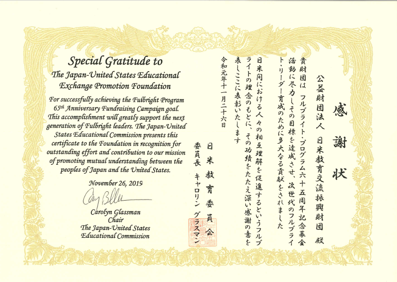 日米教育交流振興財団がフルブライト日本同窓会の協力を得て2017年3月から進めていたフルブライト・プログラム65周年(FP65)記念募金(発起人代表 橋本徹みずほフィナンシャルグループ名誉顧問、FP65募金実行委員長 今関源規同窓会副会長)は2019年9月末に終了し、個人募金、企業・団体募金を合わせて、目標の1億円を上回る総額1億2,831万円を達成しました。この成果に対して、11月26日、フルブライト留学制度の運営主体である日米教育委員会(JUSEC)のCarolyn Glassman委員長(駐日米国公使)より財団の文野千年男理事長らに感謝状が授与されました。募金で集まった資金は財団を通じて、日米の現役フルブライト留学生への奨学金として活用されます。