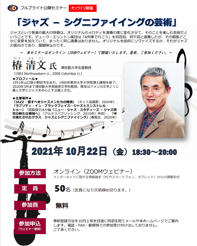 新型コロナのため2020年春から休止していた、同窓会と日米教育交流振興財団の共催によるフルブライト公開セミナーが約1年半ぶりにオンラインで再開されました。再開第1弾として、2021年10月22日夕、椿清文 津田塾大学名誉教授(1983 Northwestern U, 2008 Columbia U)がジャズに関する講演を行いました。約40名が参加、大変好評でした。