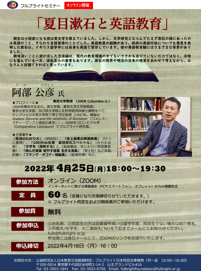 2022年度第1回のフルブライト・セミナーが4月25日夕、オンライン(ZOOM)で開催されました。東京大学文学部教授(英文学)の阿部公彦氏(2008 Columbia U)が「夏目漱石と英語教育」と題して講演しました。参加者は30名強でした。