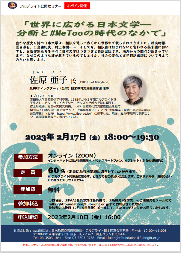 フルブライト日本同窓会と日米教育交流振興財団(フルブライト記念財団)の共催によるオンライン・フルブライト公開セミナー開催のご案内です。