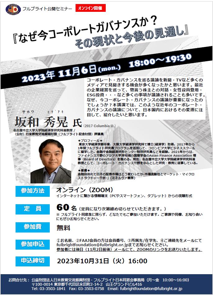 株主利益重視型のアングロ・サクション諸国においても、ステークホールダー重視型の日本や大陸ヨーロッパにおいても、会計不正などの企業経営者の行為を防ぐことができませんでした。日本企業のコーポレート・ガバナンスは欧米の投資家・メディアからまだまだ不完全との批判を被っています。今後の日本の企業・経済の成長のためには、どのような考え方の下でのコーポレート・ガバナンスが不可欠か?名古屋市立大学大学院経済学研究科・准教授 坂和秀晃氏(2017 Columbia U.)が、日本に於けるコーポレートの現状と見通しについて、豊富な事例を交えて展望しました。