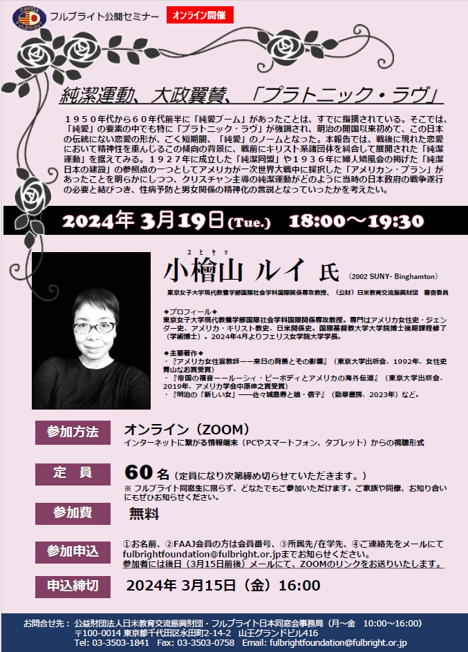 1964年、プラトニックな恋愛映画「愛と死をみつめて」は当時の日本人を熱狂させました。しかし今、この映画のことを知る学生はいません。戦後のある一時期、ごく短い期間だけ存在した「プラトニック・ラヴ」。長い日本の歴史において存在しなかった「純潔」の規範がキリスト教の影響によってもたらされ、戦時中の戦意高揚・詩歌翼賛を経て戦後のプラトニック・ラヴの時代に至る経緯を、東京女子大学現代教養学部国際社会学科国際関係専攻教授・小檜山ルイ氏(2002 SUNY-Binghamton)が比較文化的視点から考察しました。(講演の要約をフルブライト日本同窓会NEWSLETTER NO.37(December2024)に掲載の予定です)